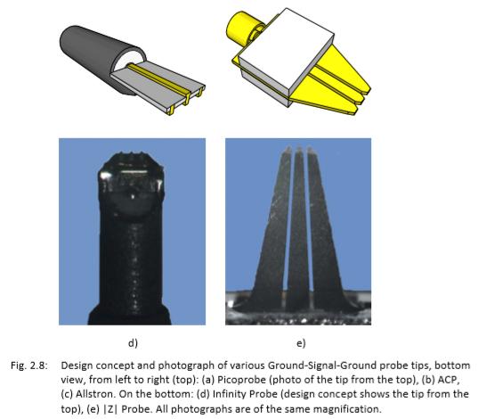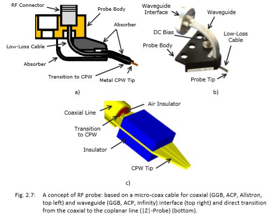 除了以上基本的GSG, GS, SG類型的探針,還有各種組合,如GSGSG,GSSG,SGS等等。探針本身需要很好的匹配內(nèi)部不同傳輸媒介的特征阻抗,要求保證在不同傳輸模式下電磁能量的高效傳輸。一個(gè)傳統(tǒng)的射頻探針包括了以下幾個(gè)部分: